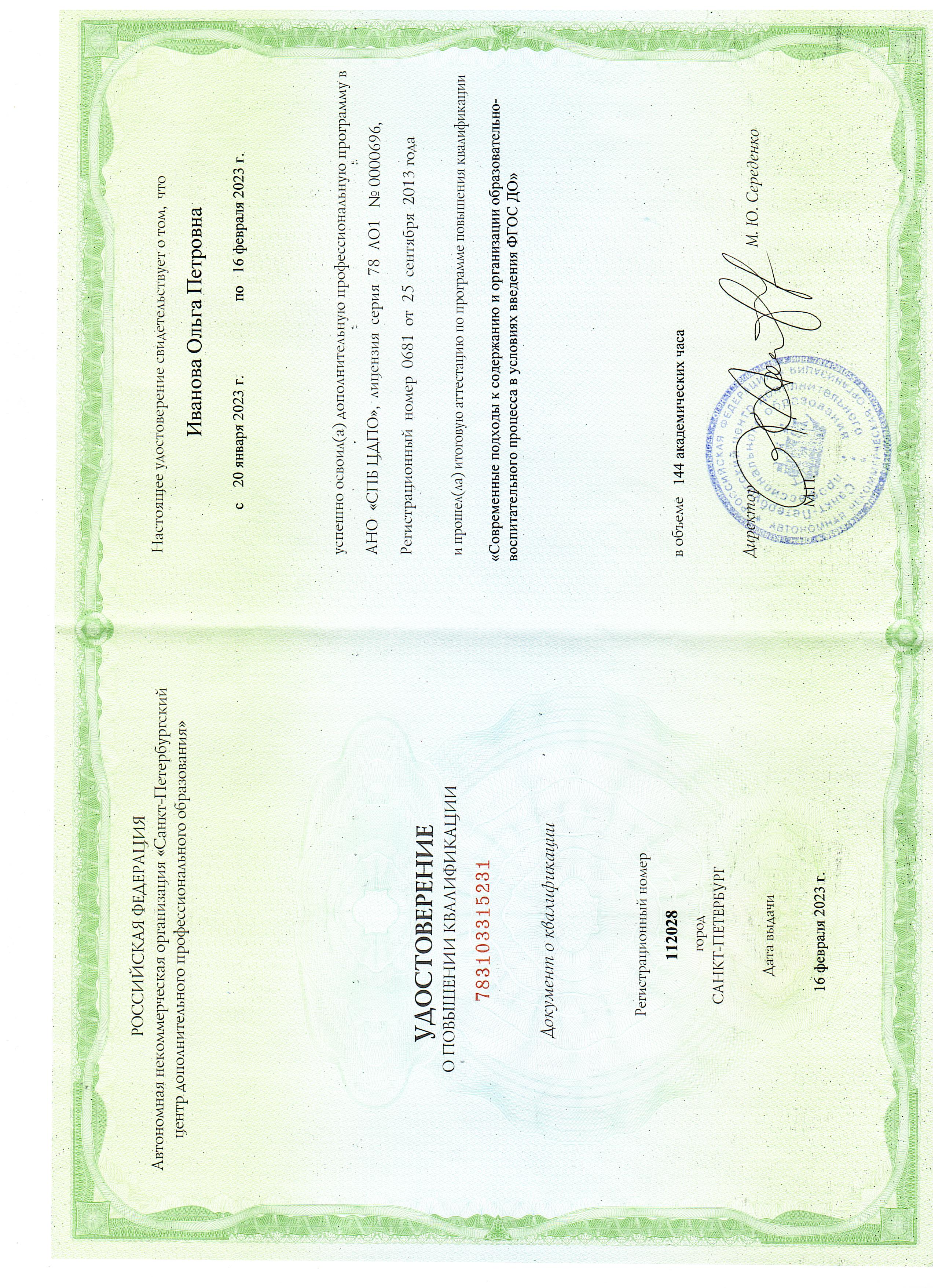 Закончила Торжокское педагогическое училище в 1986 г. Квалификация - воспитатель в дошкольных учреждениях.