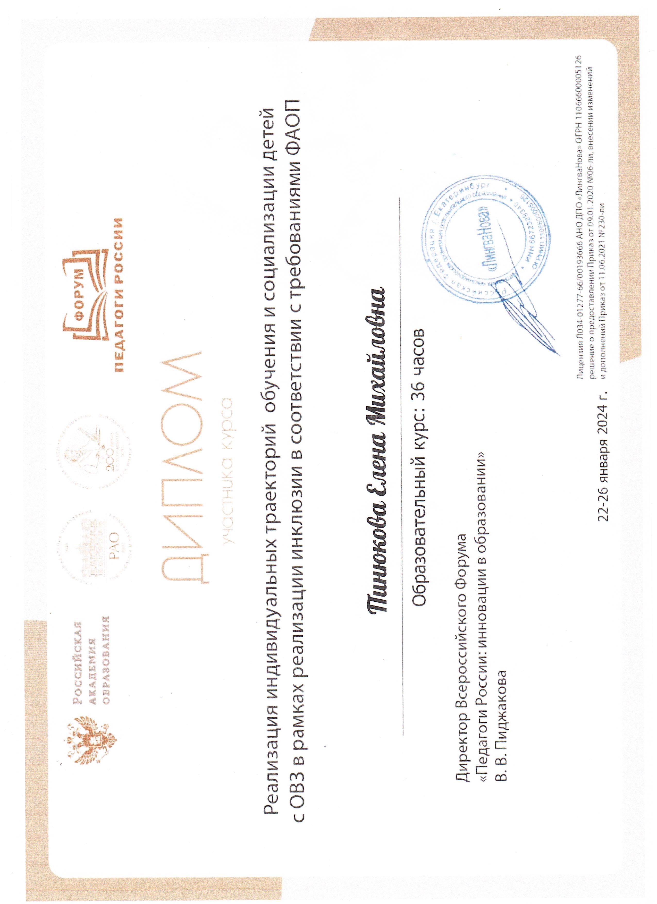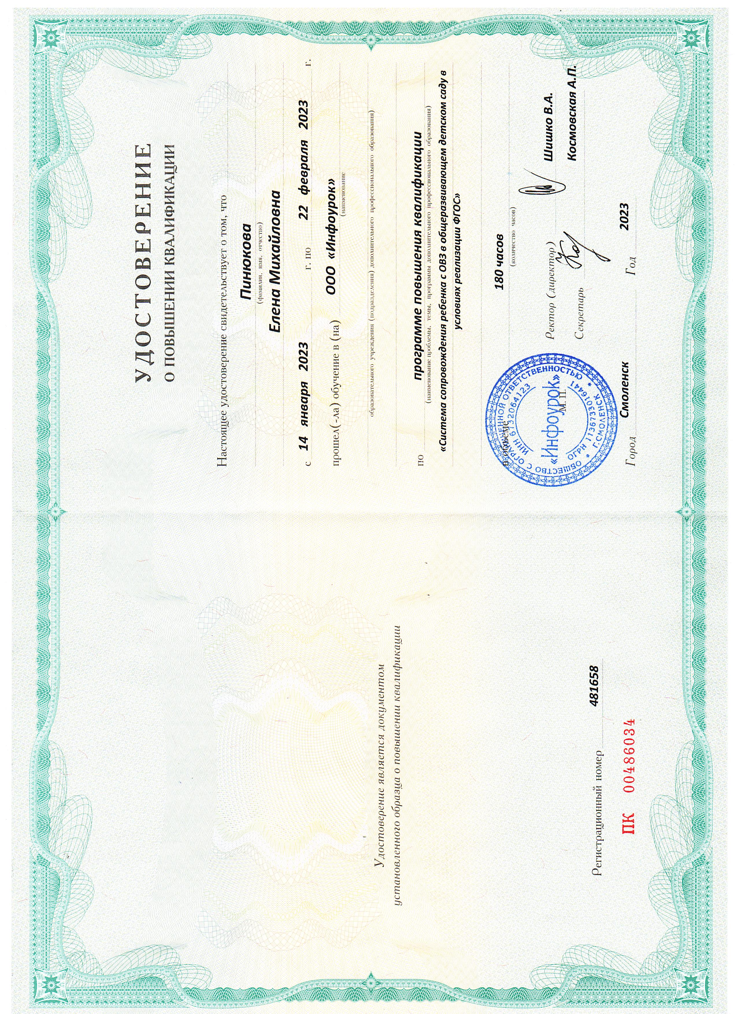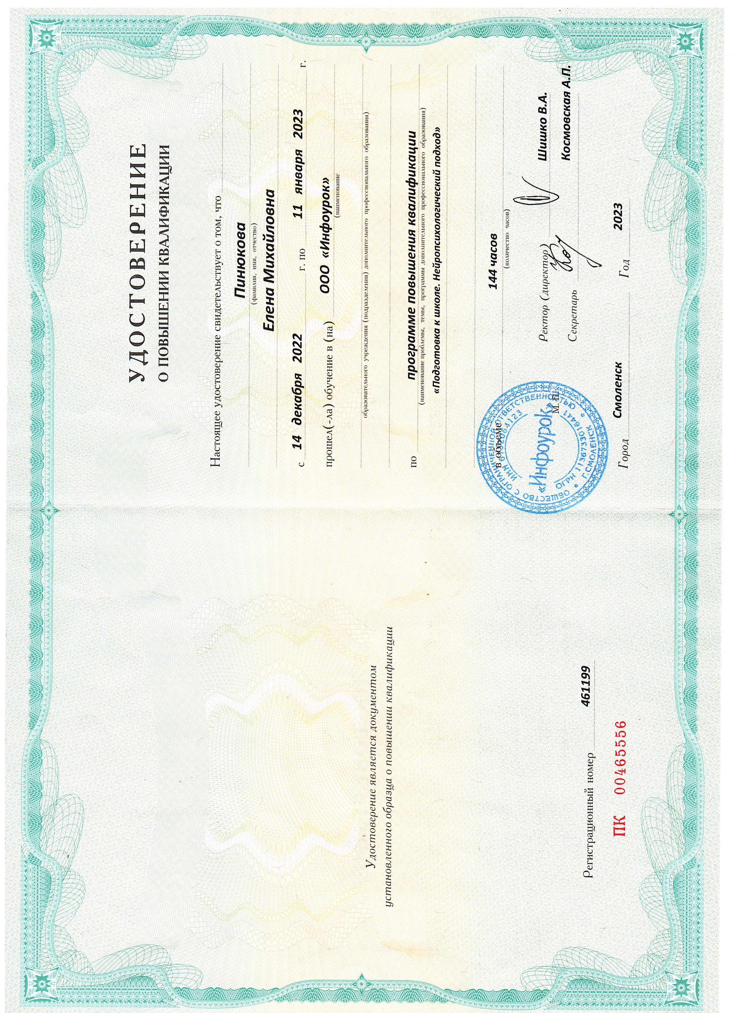 2023 г. ООО "Инфоурок" г.Смоленск «Подготовка к школе. Нейропсихологический подход», 144 час.