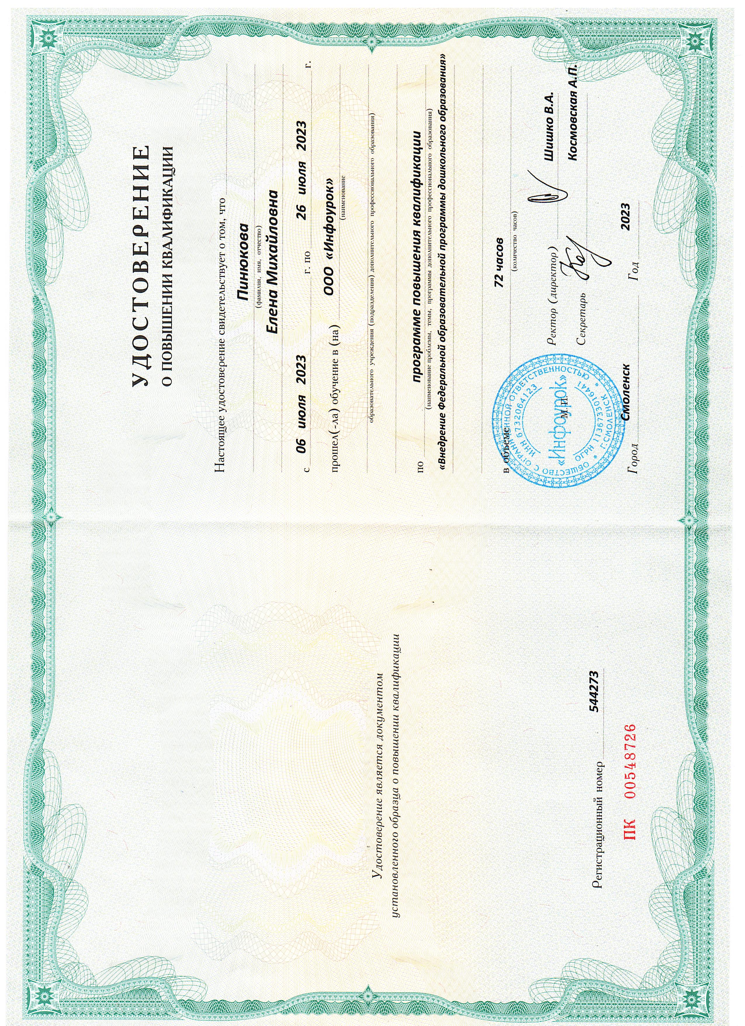 2023г. ООО "Инфоурок" г.Смоленск "Внедрение ФОП ДО", 72ч.