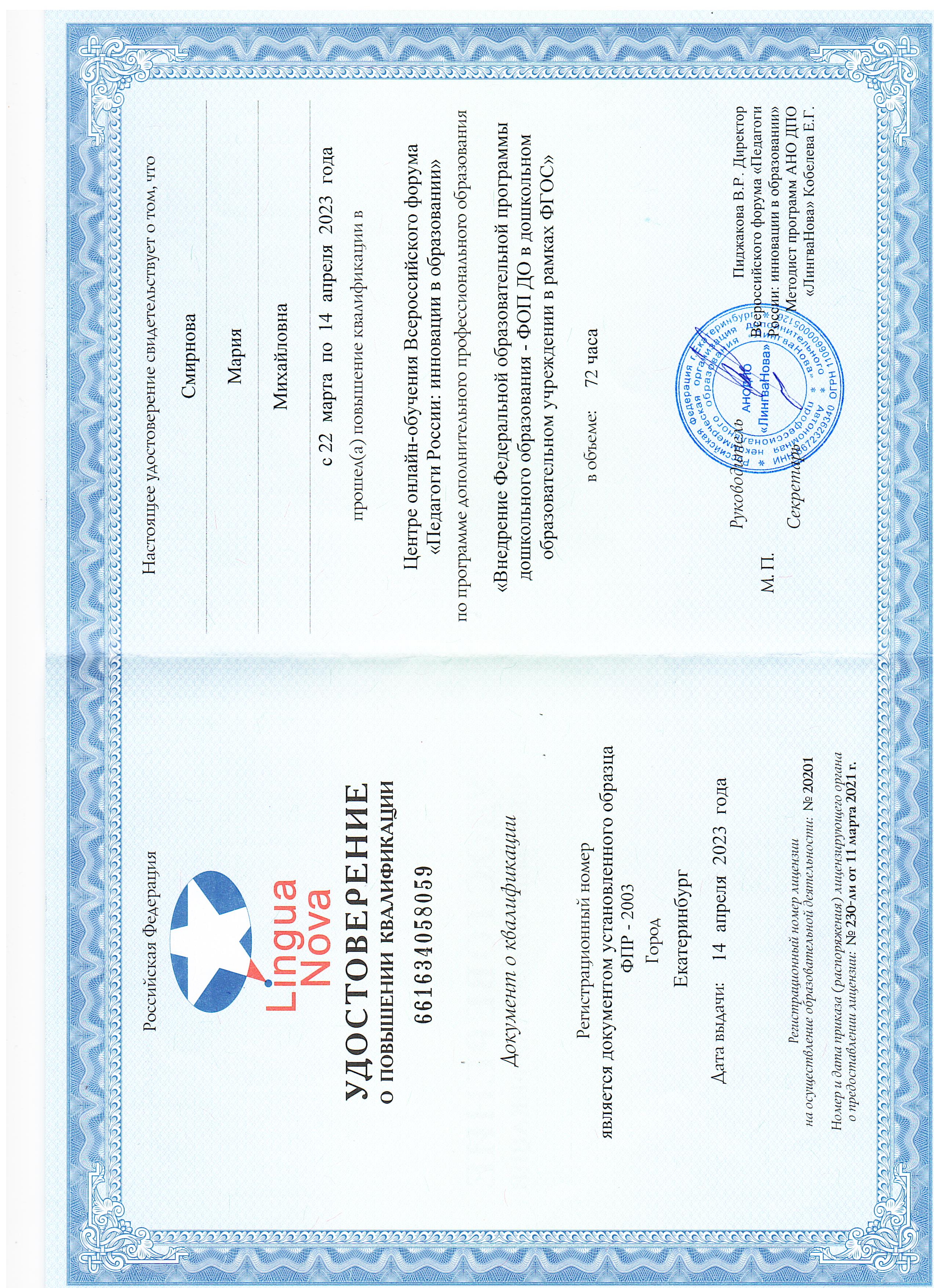 2016г. -прохождение курсов профессиональной переподготовки в ООО Учебный центр "Профессионал" г.Москва по программе "Воспитание детей дошкольного возраста", 300часов. (Присвоение квалификации Воспитатель детей дошкольного возраста).
