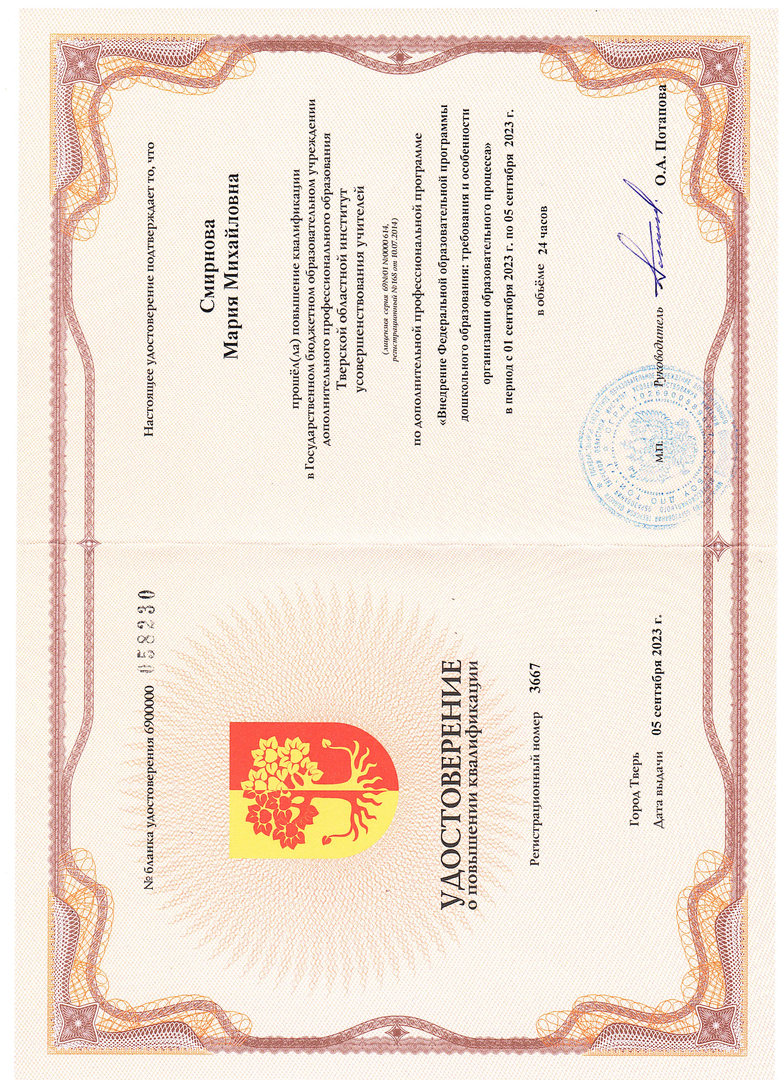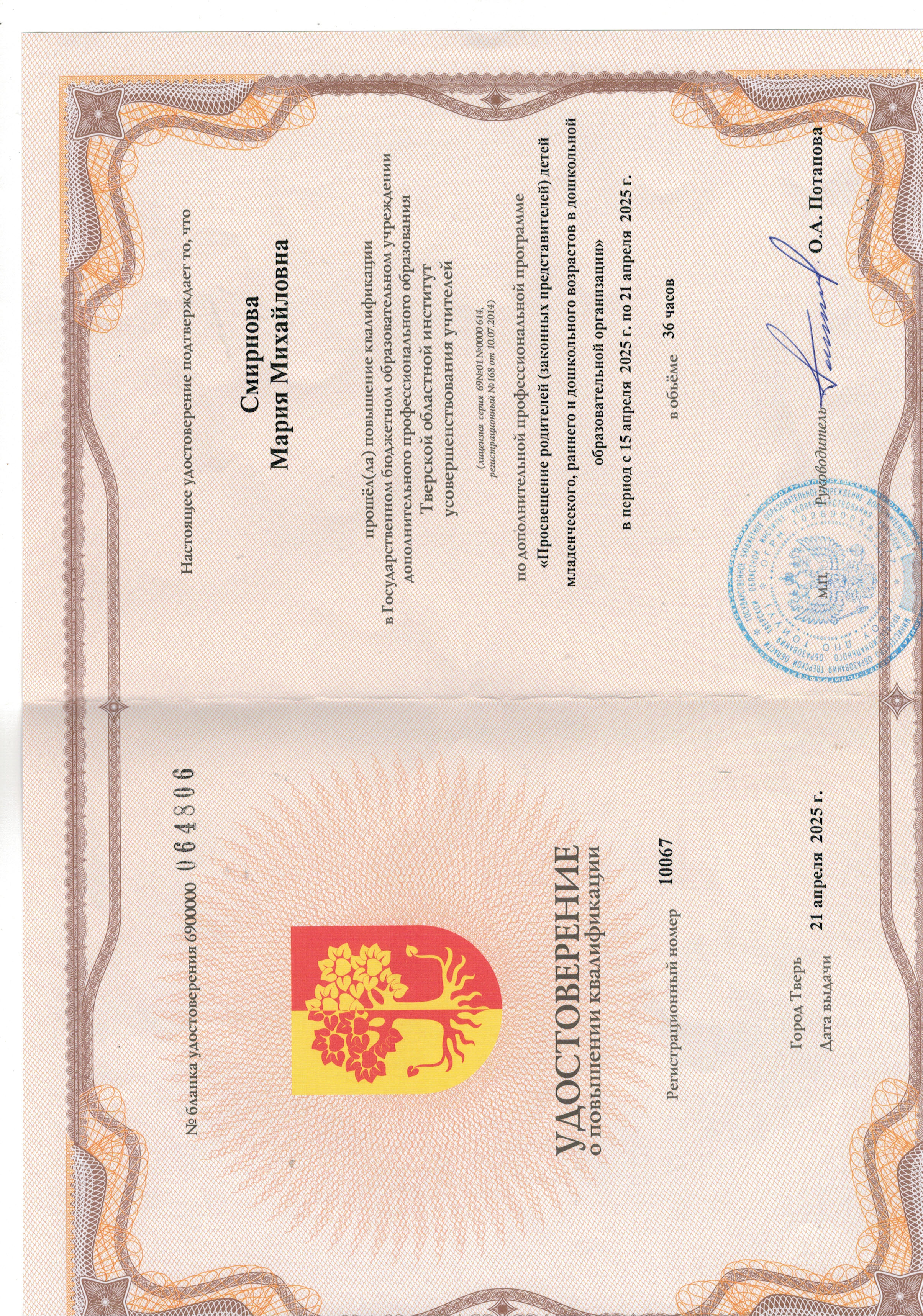 1995- 2000 годы очного обучения в Тверском государственном университете на Педагогическом факультете, ПиМНО. (Учитель начальных классов).