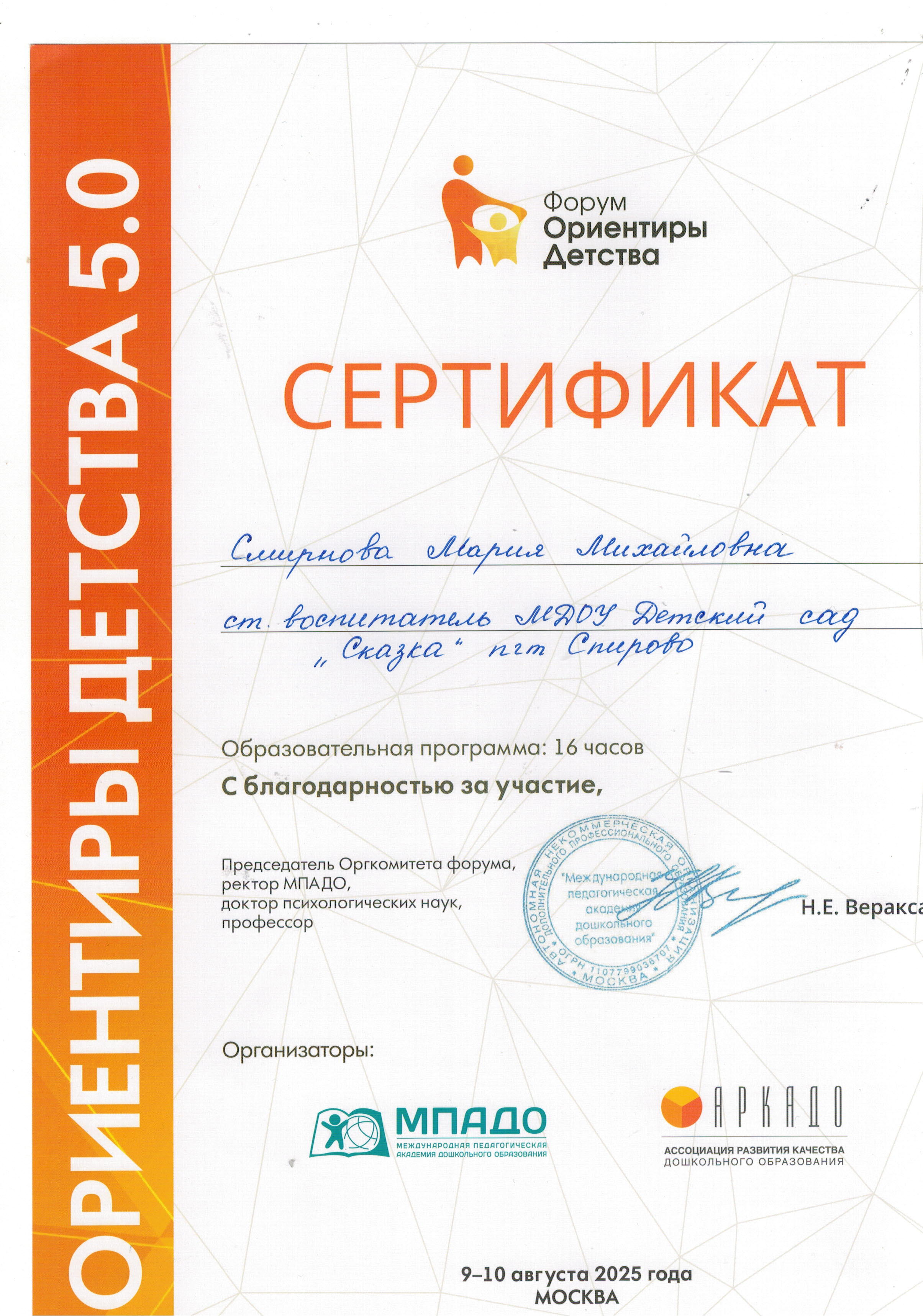 2025 г. Сертификат форума "Ориентиры детства 5.0", 16 ч