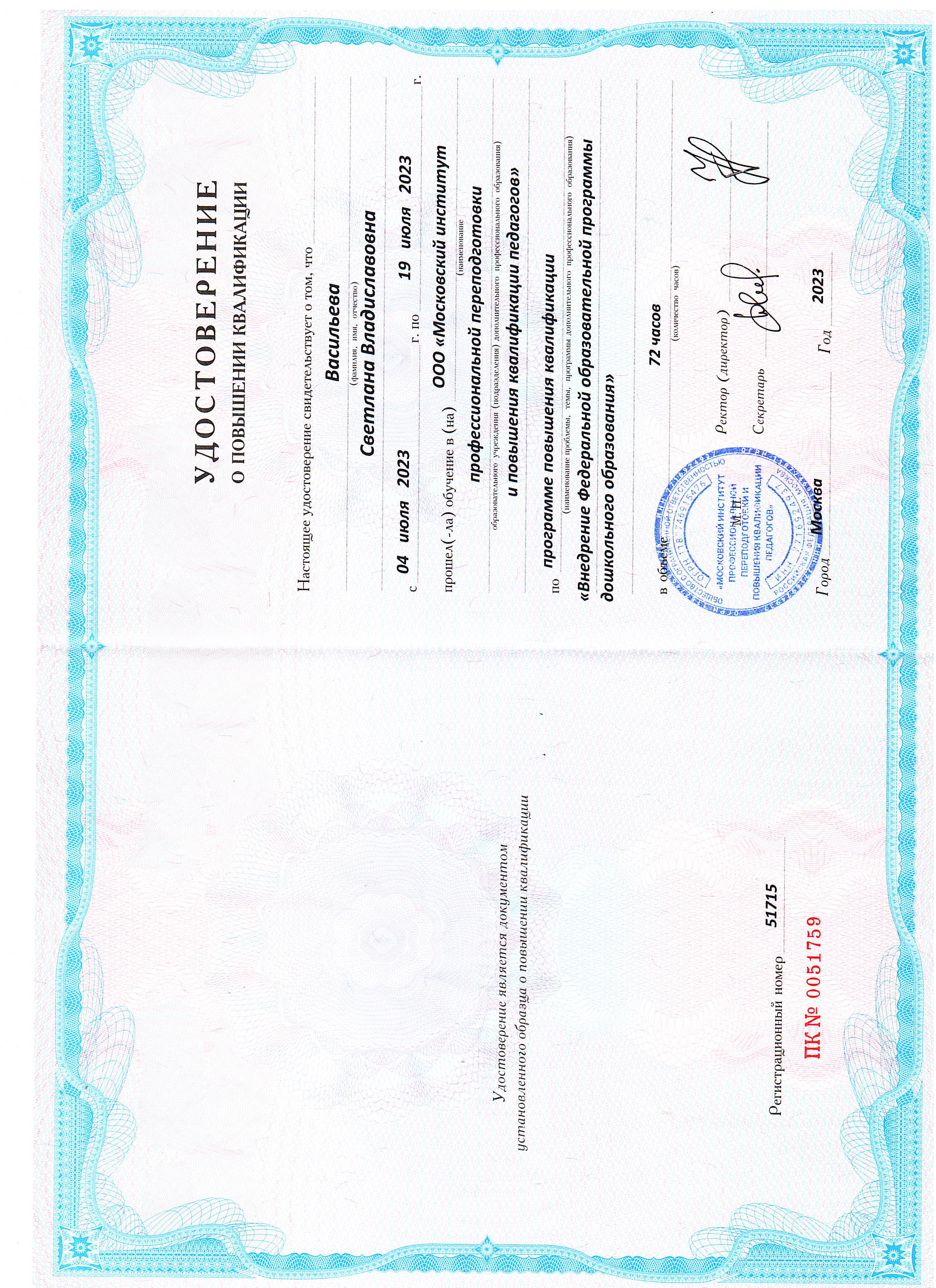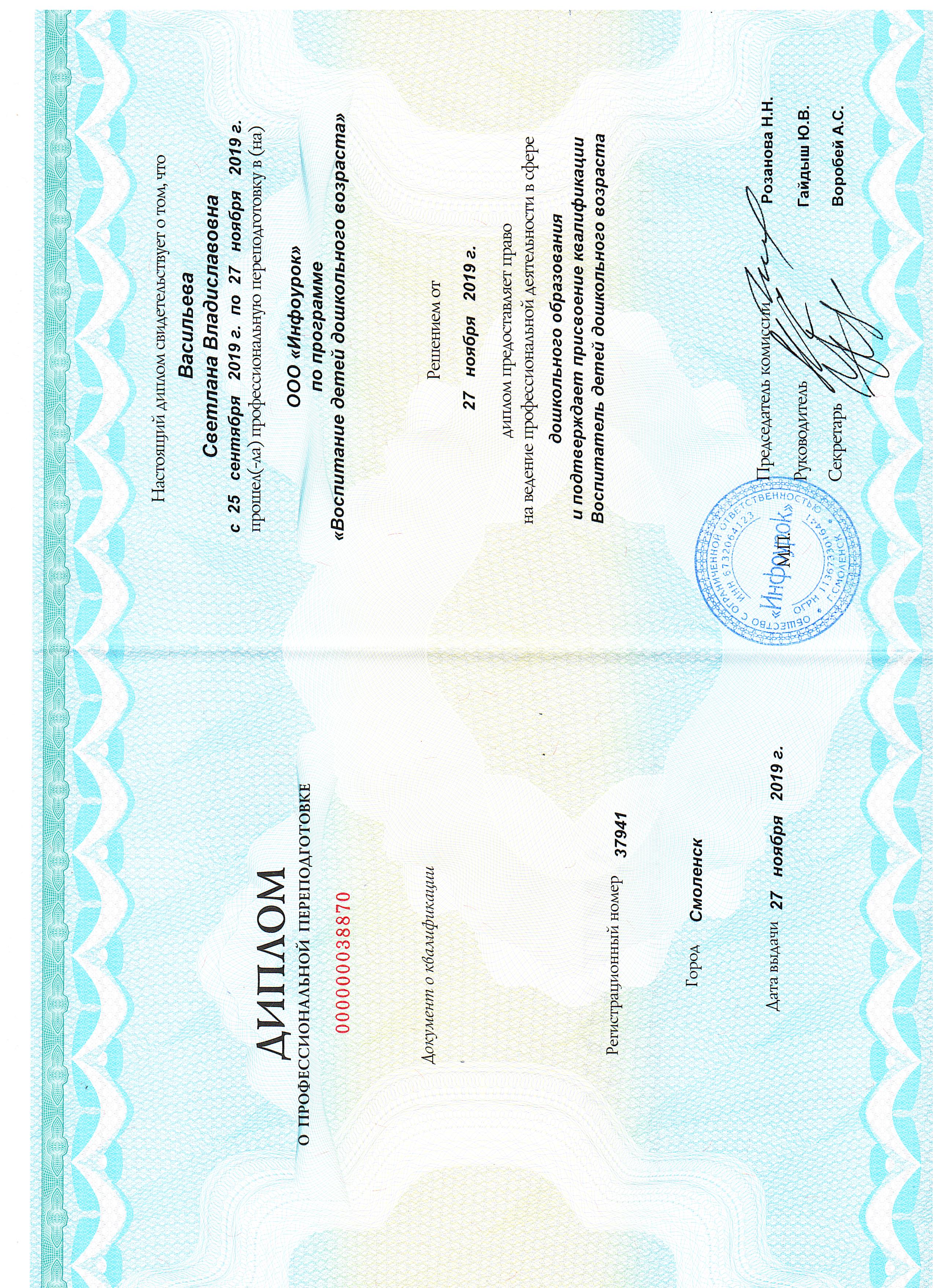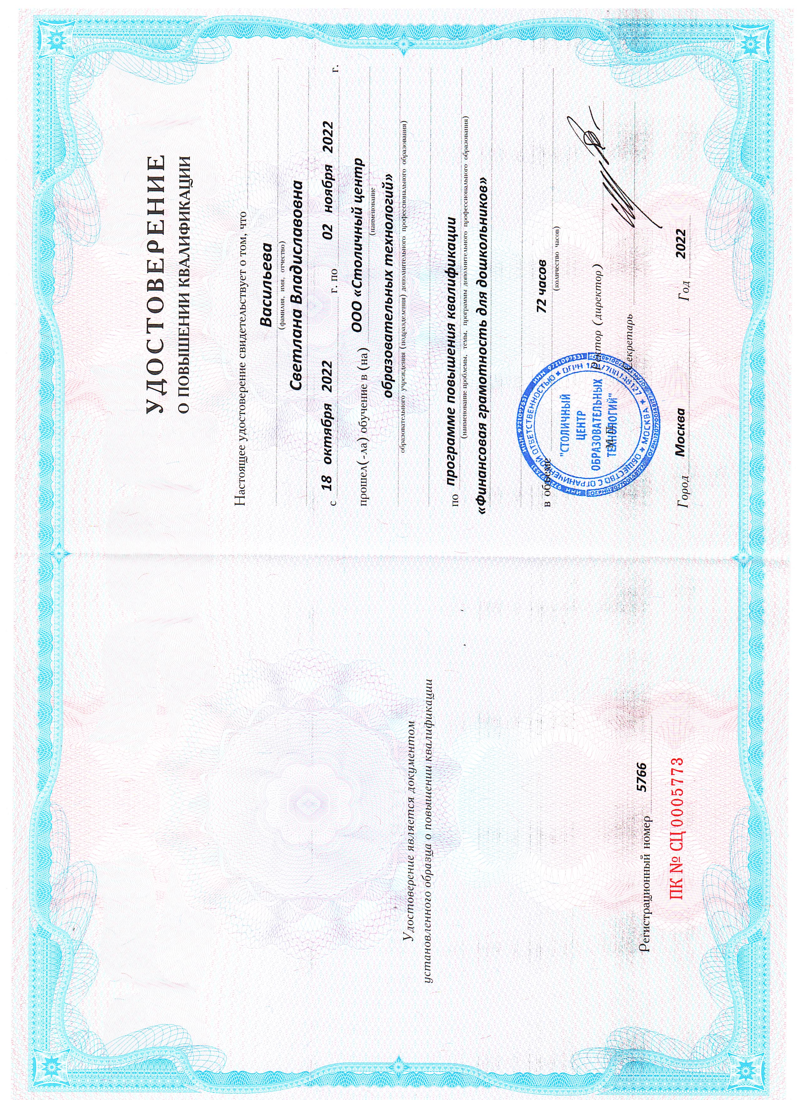 2022 г. ООО "Инфоурок" г.Москва «Финансовая грамотность для дошкольников» 72 час.