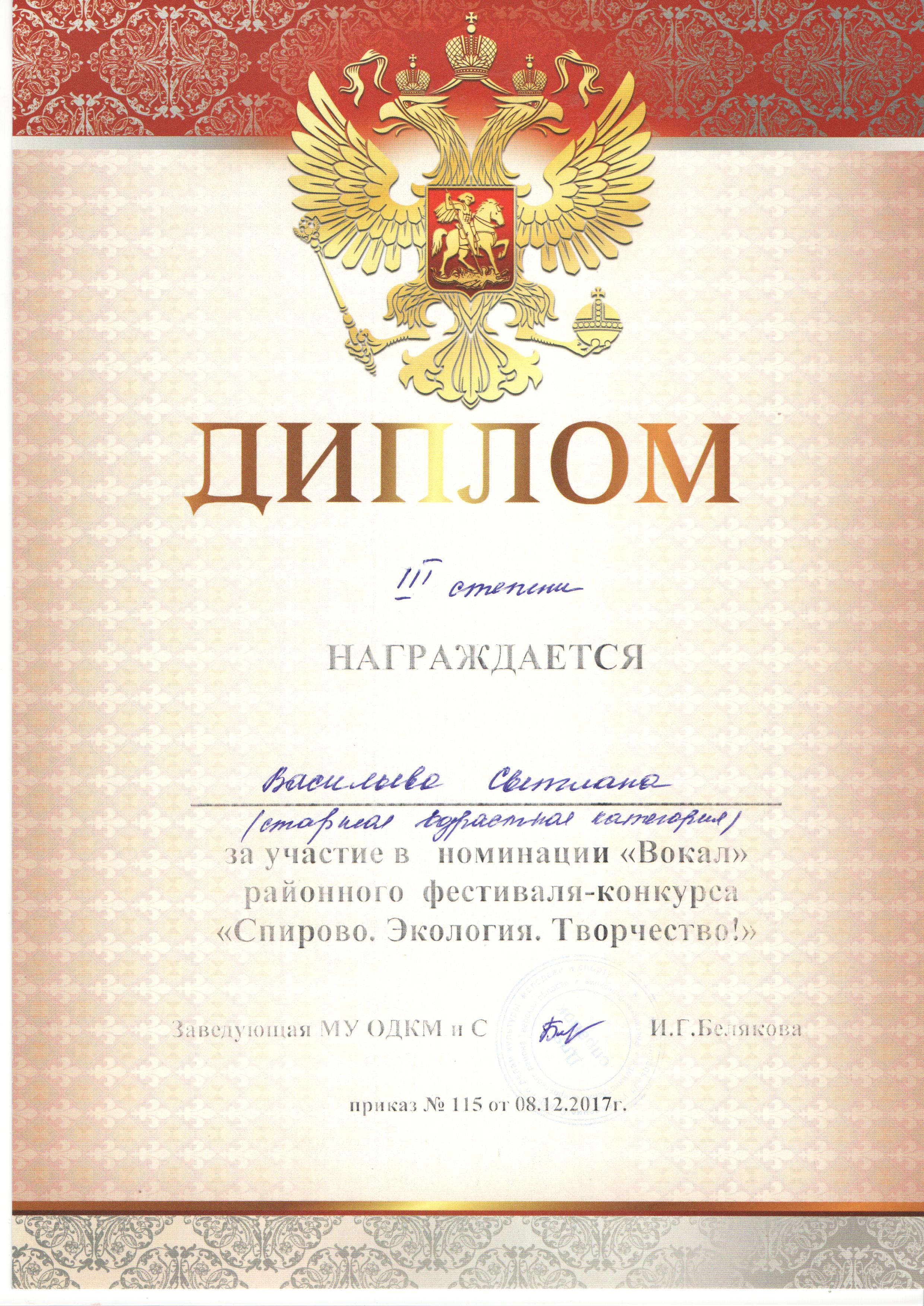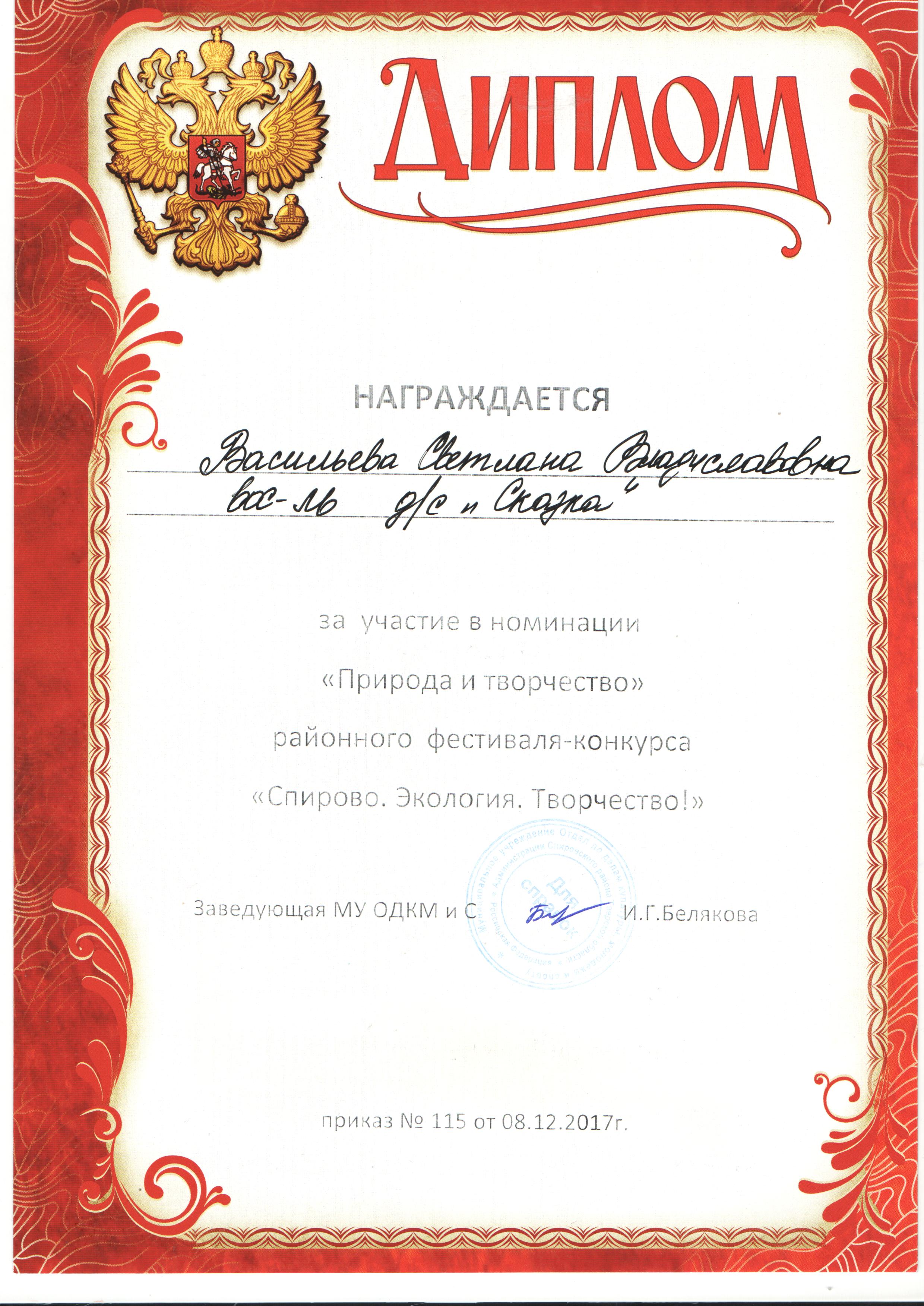 | Диплом 3 степени "Спирово.Экология.Творчество" | ||